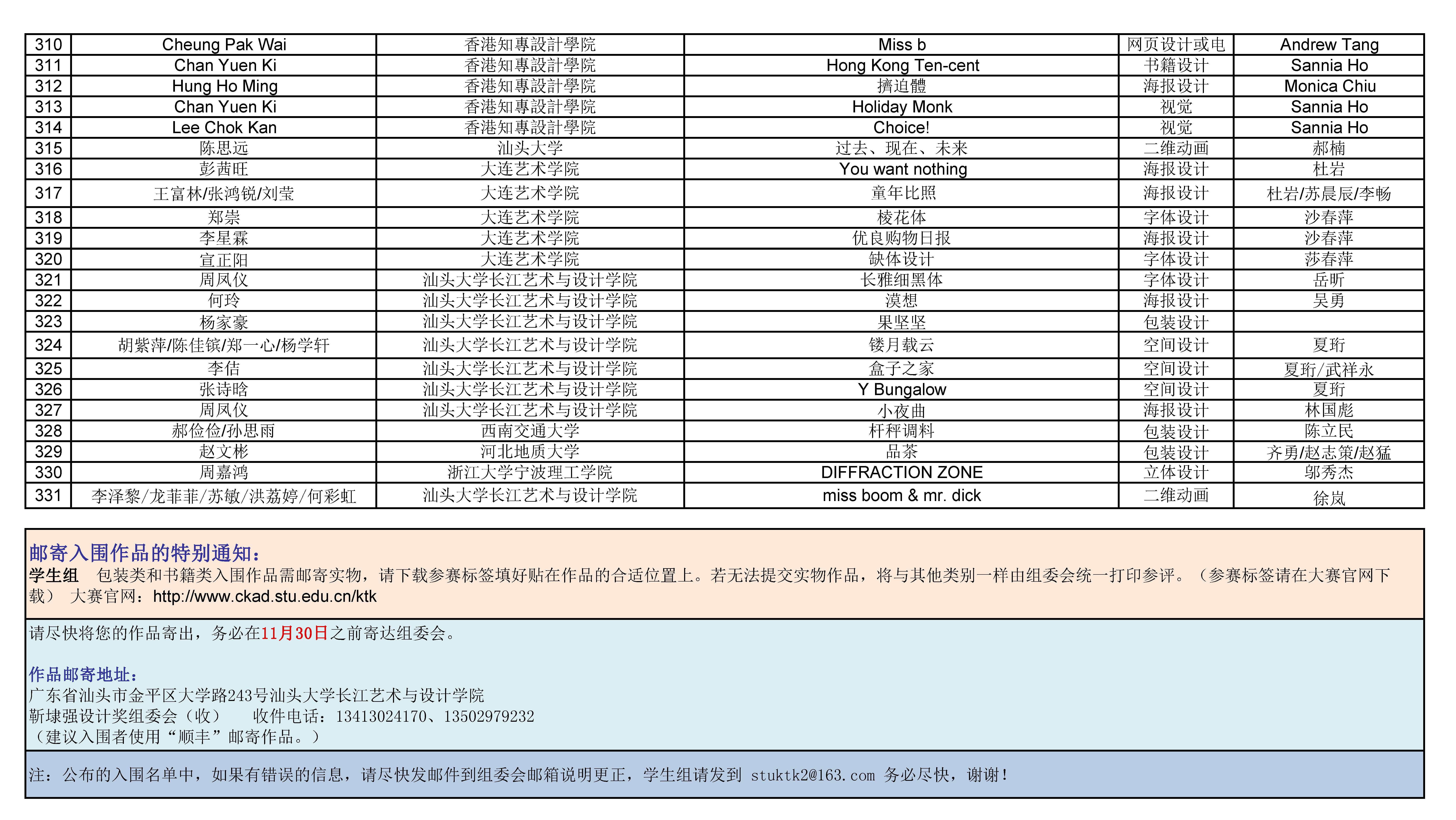 注:公布的入围名单中,如果有错误的信息,请尽快发邮件到组委会邮箱说明更正,