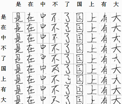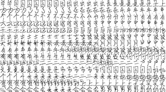 我们可以通过人工神经网络制造软件去探索一个字所幻想的伪汉字。(可看到下图中的汉字,在本身字的形体上在不断的进行着改变,但无论怎么改变,都没有脱离自身的形体)。