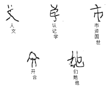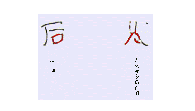 刚才探索了多个字之间的相互变化,那么部首间会不会也有联系,例如:下图中左(后、台、名)都拥有“口”字旁,如果“口”不变而是其它部分在发生改变。 右中是拥有“人”字旁(人、从、会、今、仍、任、件)几个字的系列。在不同的字的转变,能很清楚的看到“人”字在这几个字中连续性的变化。