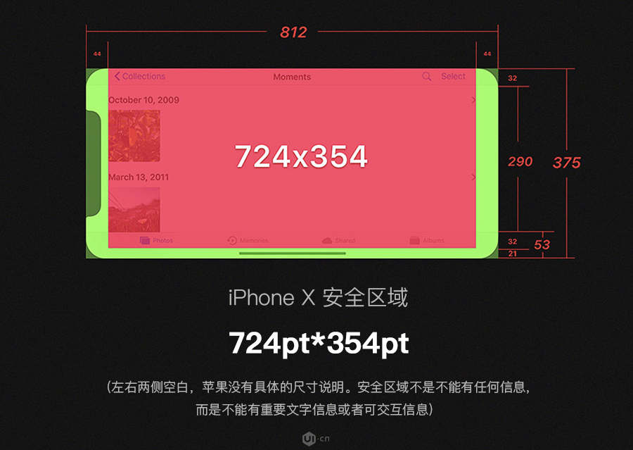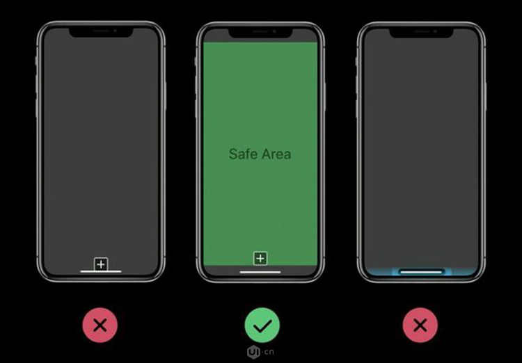 为了不影响内容的显示,必须保证所有内容不能被圆角、上方“刘海”和底部指示器遮挡,所以要在安全区域内进行设计。