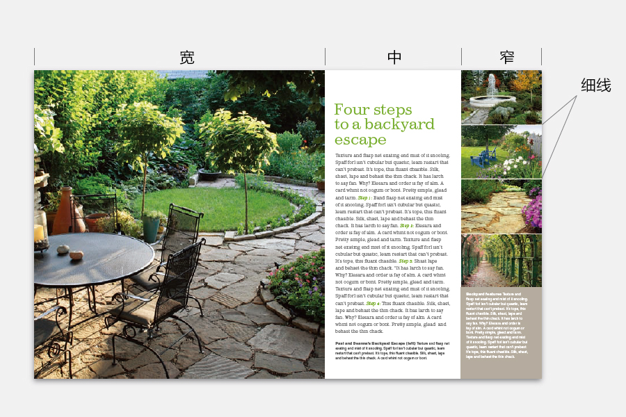 图片加上文字无疑能起到“一加一大于二”的效果,为了达到最佳的效果,不要去干扰这张图片所传达的信息,让它自己向读者介绍。同时,介绍性的文字静静地放在一边。留意右边折页的行距很大,呈现一种与图片风格配合的清新气息。