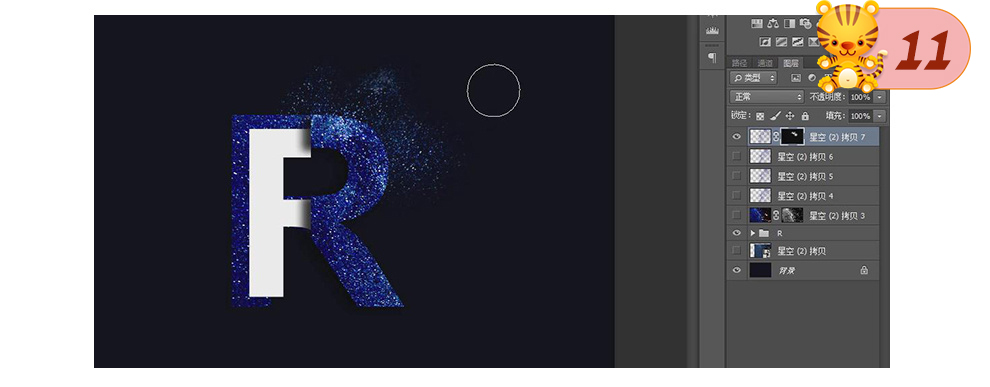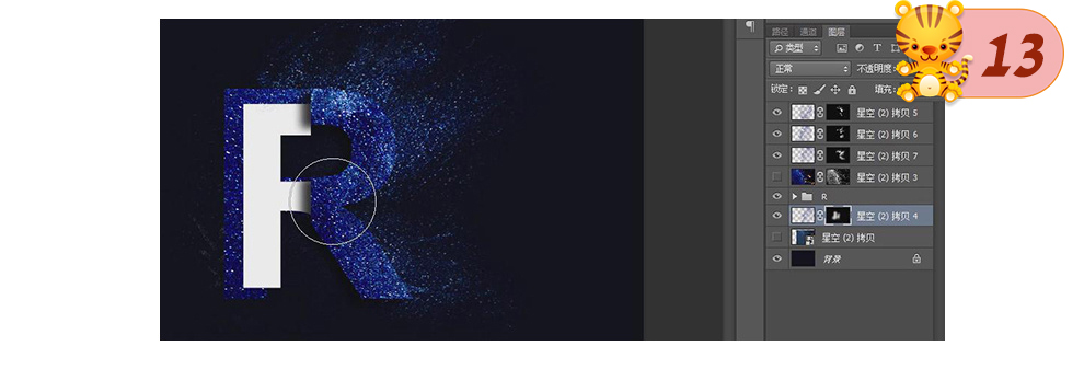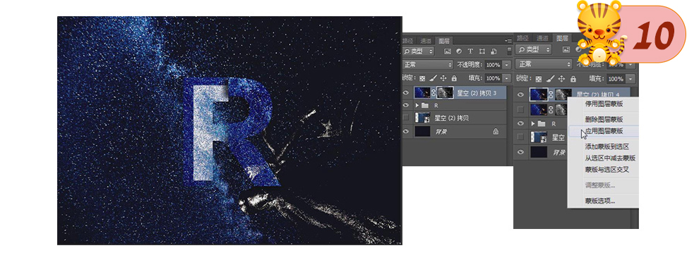 13、将星空图层放在文字图层下方,建立黑色蒙版,使用上述方法制作星辰效果。