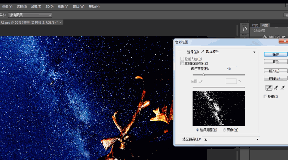 8、将字母图层【建组】,【复制】星空图层,点击【选择】-【色彩范围】。