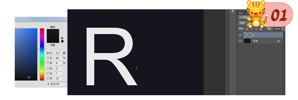 1、打开PS,新建【画布】,【填充】背景色R:2 G:7 B:15,使用【文本工具】输入大写字母R,【自由变换】至合适大小。