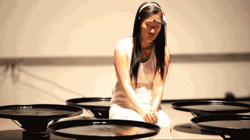 通过探索人类的弱点、自我控制与个性解放等问题,Park再现了人们喜闻乐见的功夫电影或《杀死比尔》被剪片段中的场景。图中,Park头戴着嵌有电流传感器的未来感耳机,在冥想的同时监视自己的大脑活动。而大脑力量导致盘中水震动的过程,便是禅意的表现。