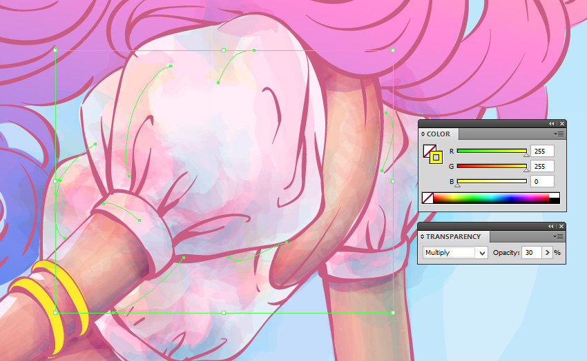 最后,装饰你的插图的上半部分,明亮的黄色斑点。用铅笔 工具(N)绘制它们,复制 它们,并将它们放在你的角色周围。