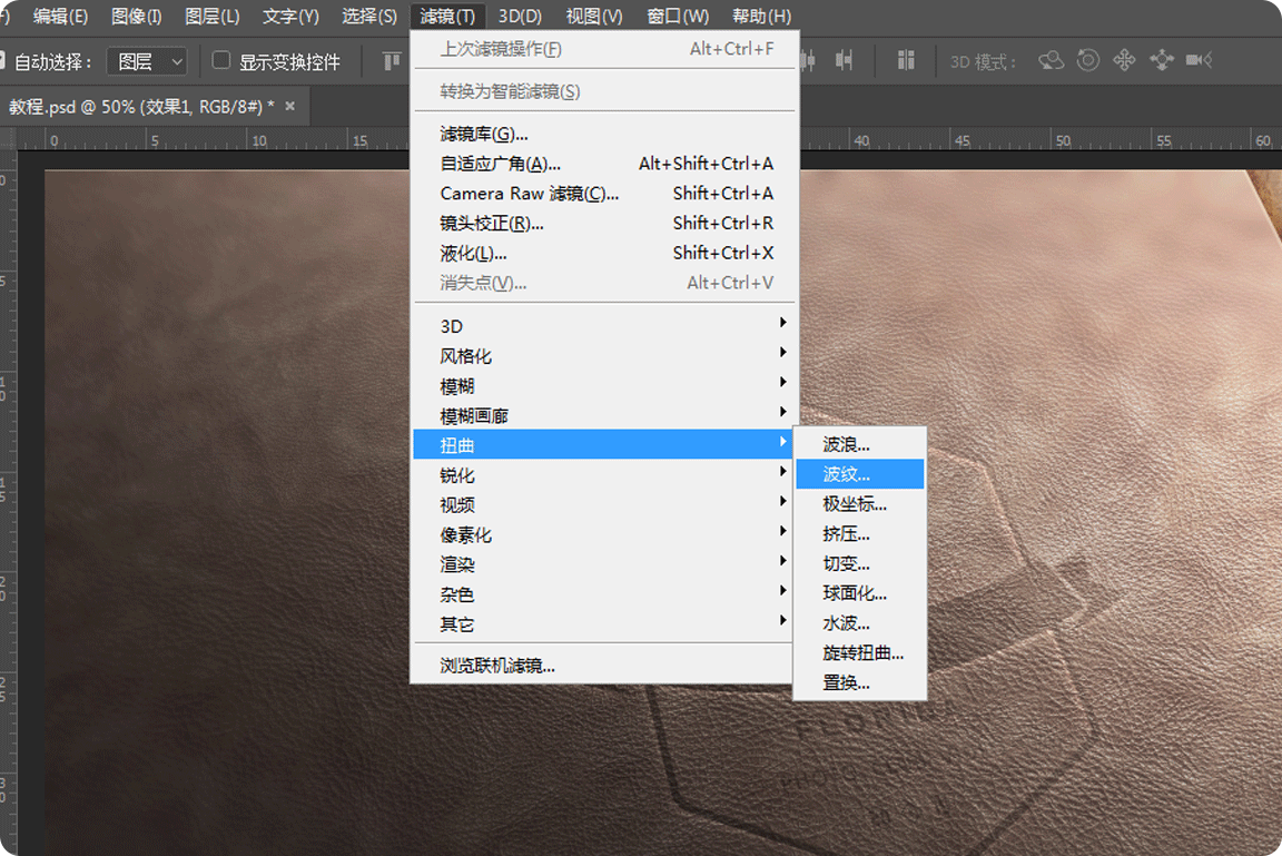 现在我们在“效果1”图层上操作,点击滤镜—扭曲—波纹。