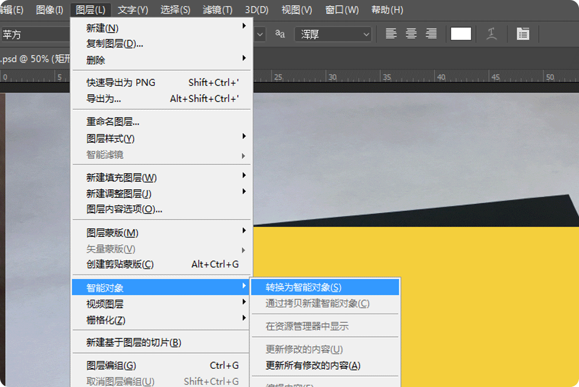 到了很关键的一步!我们要把这个矩形转换成智能对象,弄不好后面都白玩。点击图层—智能对象—转换为智能对象。