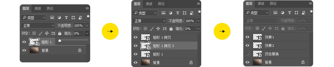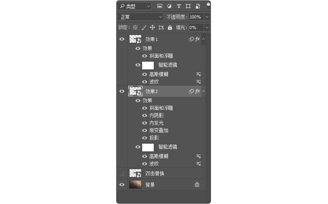 把智能图层的“填充”改为0%,并复制出两个,现在这三个一样的图层分别改名叫“效果1”、“效果2”和“双击替换”。我们把“双击替换”图层前面的眼睛关掉,它存在的目的是为了以后方便替换其他logo或图案,所以没必要显示。