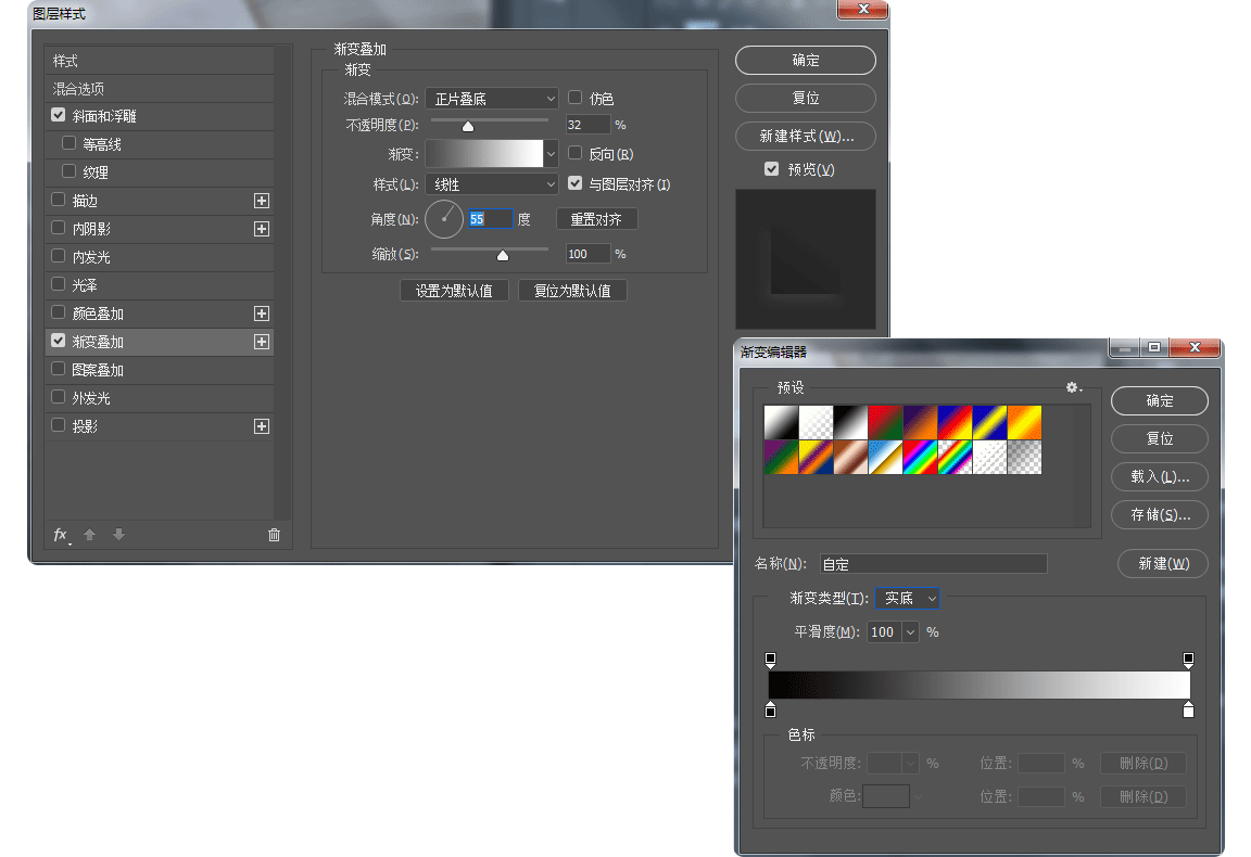 可以看到背景图是有明显光源的,所以需要添加一个渐变来贴合背景图的效果,使其更加真实,“渐变叠加”效果的数值及渐变样式如上图。