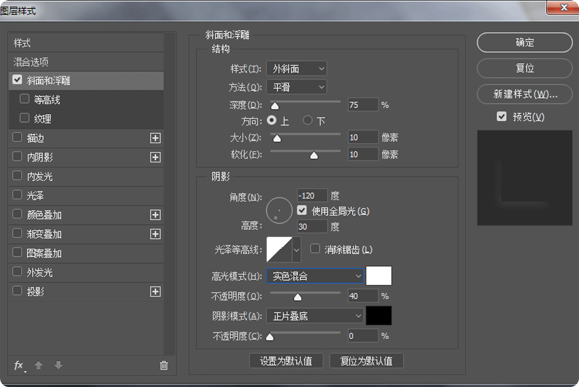 继续在“效果1”中加一个“斜面和浮雕”,数值跟之前在“效果2”中的不一样哦。