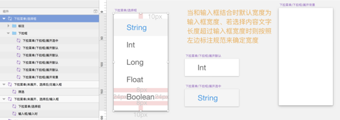 把背景和选择状态都做成了组件,好处是更加灵活的使用下拉菜单组件(可根据选项数量和宽度来调整)。文字部分也用了智能缩放。需特殊注意的在组件中表达不出的可在组件旁边进行标注。如图 7-1-1。