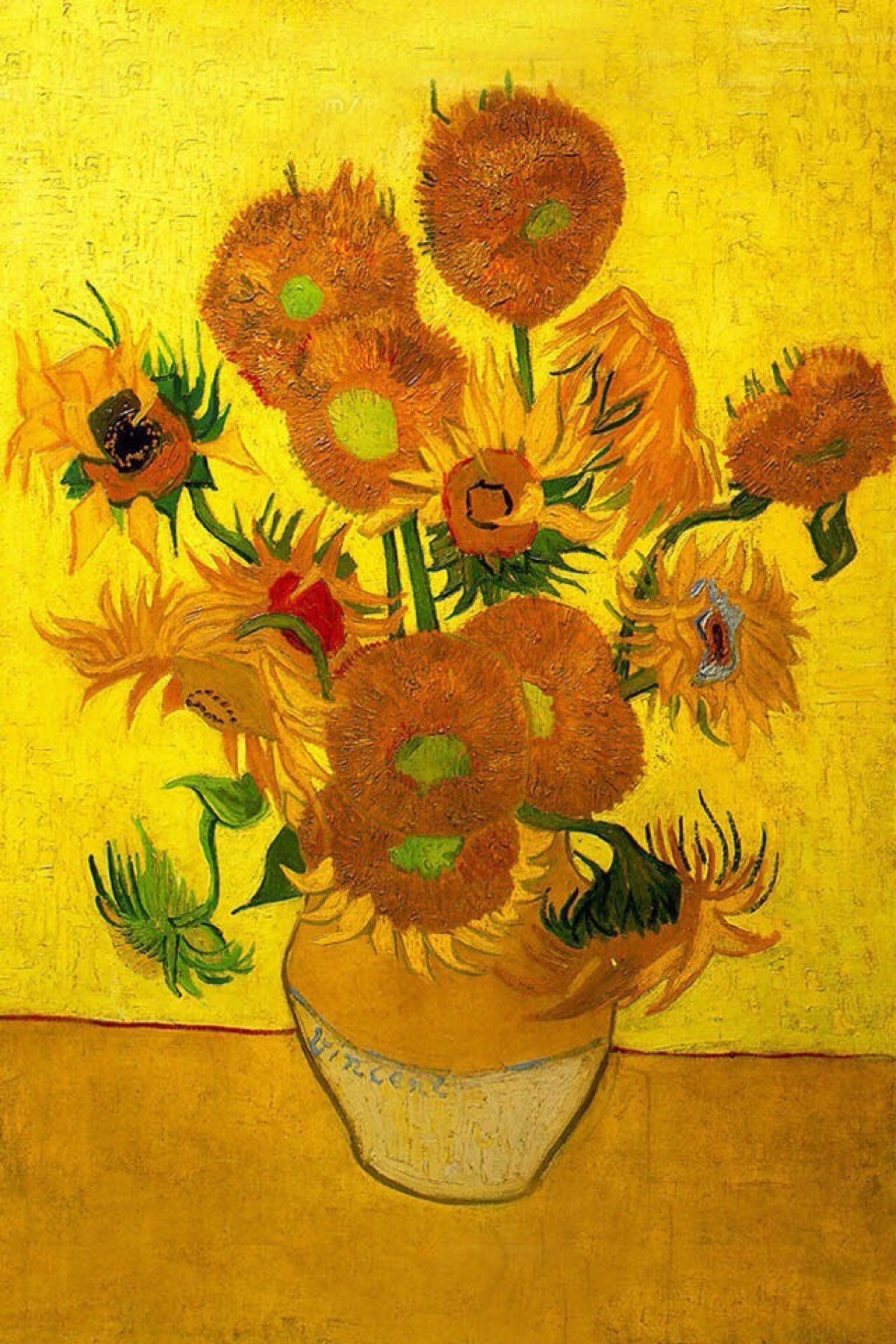 梵高想给高更布置一个温暖的房间,他去田间摘了许多向日葵,并画了向日葵在一天各个时期的模样,置于相框中挂在墙上。