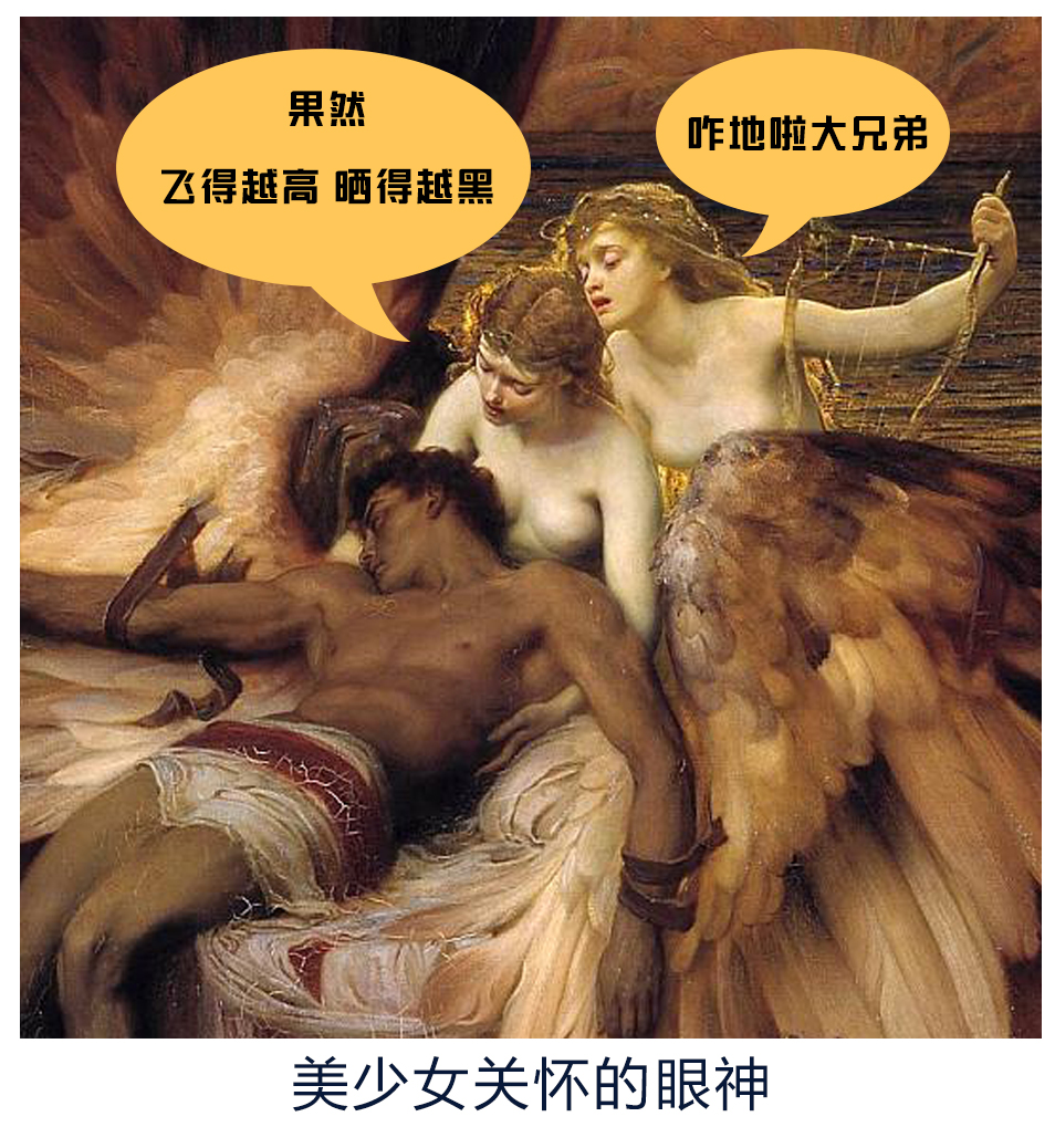 但是飞的兴起的伊卡洛斯,在烈日阳光下越飞越高,终于,高温融化了用来粘合翅膀的蜡,折翼的伊卡罗斯坠入大海,被埋在了伊卡利亚岛。