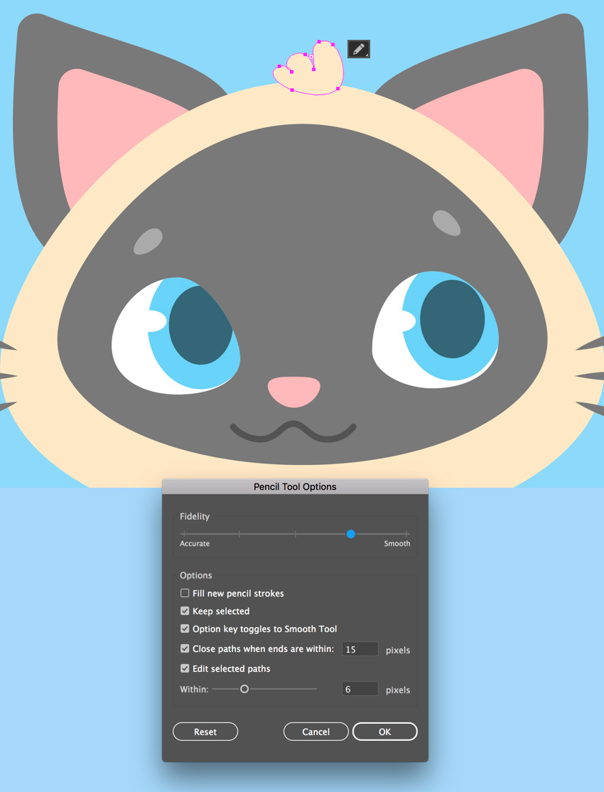 使用铅笔工具(N),通过在顶部添加一个有趣的头发来完成小猫的头部。您可以通过双击工具的设置来打开铅笔工具选项窗口来调整工具的设置。 从这里,如果您想使线条更平滑或更向左,如果您使用的是图形平板电脑以及牢固的手,请进一步向右移动保真度滑块。