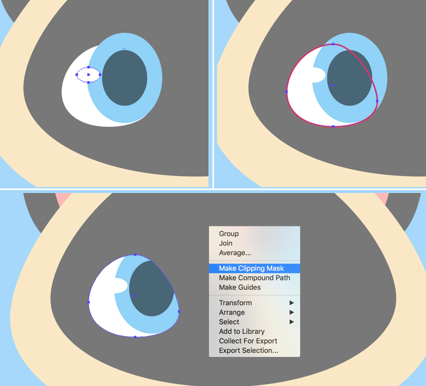 复制(Control-C)白眼球,粘贴在前面(Control-F)并置前(Shift-Control-])。 现在选择眼睛的所有元素,单击鼠标右键,然后选择建立剪切蒙版,从而将所有内容放置在顶部副本中,作为虚构容器。 此容器内的所有形状仍然可编辑。您可以在图层面板中找到剪辑组,展开它,然后移动,编辑和重新排列对象。