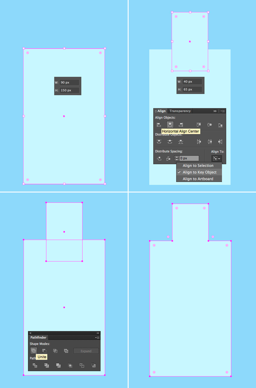 所以让我们创建一个90 x 150像素的浅蓝色矩形开始制作我们的瓶子。添加一个40 x 65像素的矩形,并将其放在第一个的顶部,形成瓶颈。