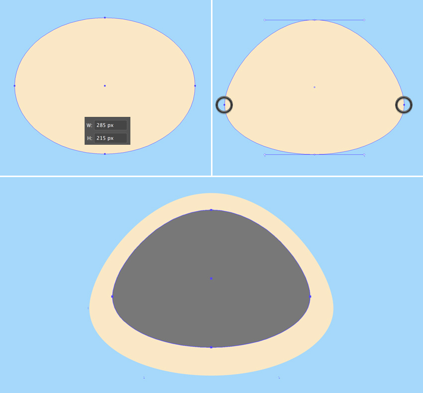 让我们开始用椭圆制作身体。创建一个160 x 210像素的深灰色椭圆。使用直接选择工具(A)选择两个侧面锚点并将它们向下移动,使形状看起来更像一个鸡蛋。