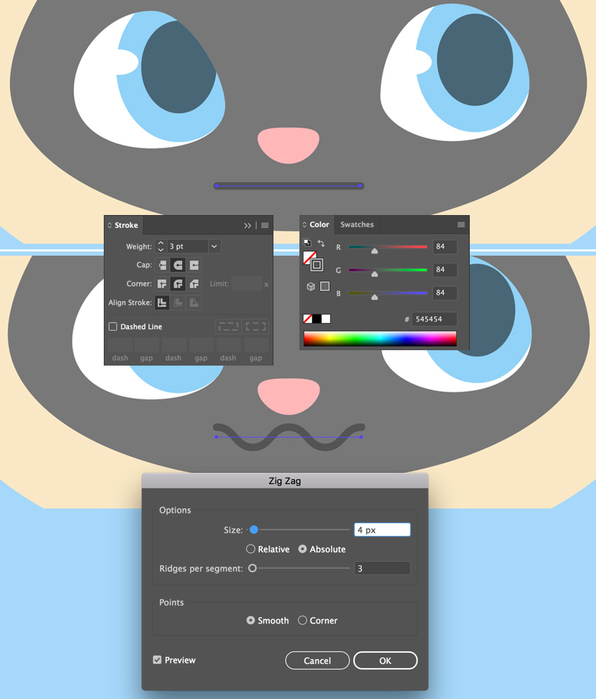 我们继续描绘嘴巴。使用线段工具(\),同时按住Shift键绘制直线。从颜色面板中应用深灰色笔画颜色。 调整线的厚度,粗细设置为3pt,并将帽盖设置为圆帽,从顶部的控制面板或描边面板(窗口>描边)。