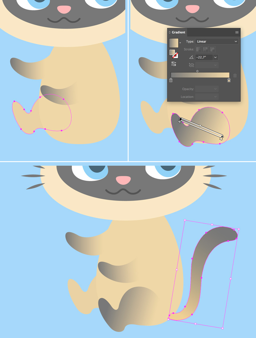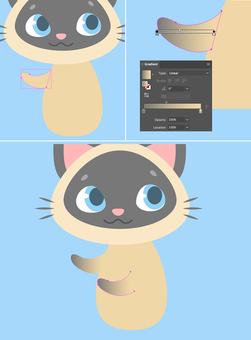让我们将一个简单的线性渐变应用到爪子上,使小猫看起来更像一个连体。使用渐变面板(窗口>渐变)将深灰色的颜色应用于左侧滑块和渐变工具(G),以调整渐变的方向,使其与身体完美融合。