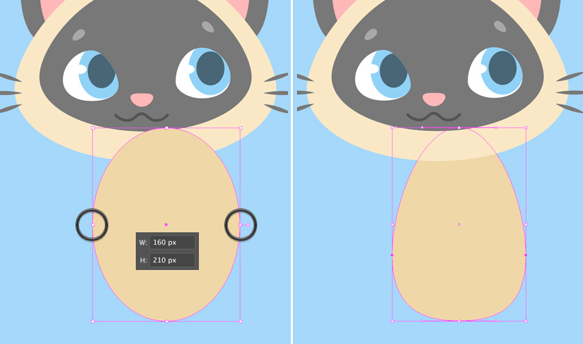 现在让我们画鼻子。制作一个25 x 15像素的浅粉色椭圆,并使用直接选择工具(A)重塑它,将其顶部和底部的锚点向下移动,使其看起来更像是一个圆形倒置三角形。