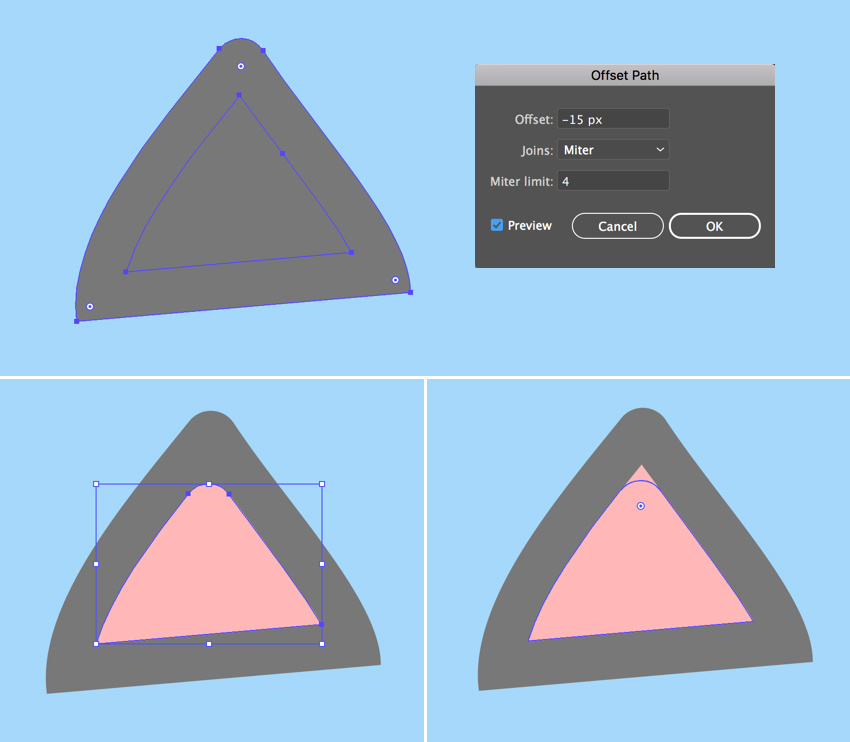保持形状的选择,转到对象>路径>偏移路径,并将偏移值设置为-15像素,将所有其他选项设置为默认值。点击OK创建一个更小的三角形,并填充它为玫瑰粉色,从而创造耳朵的内部。