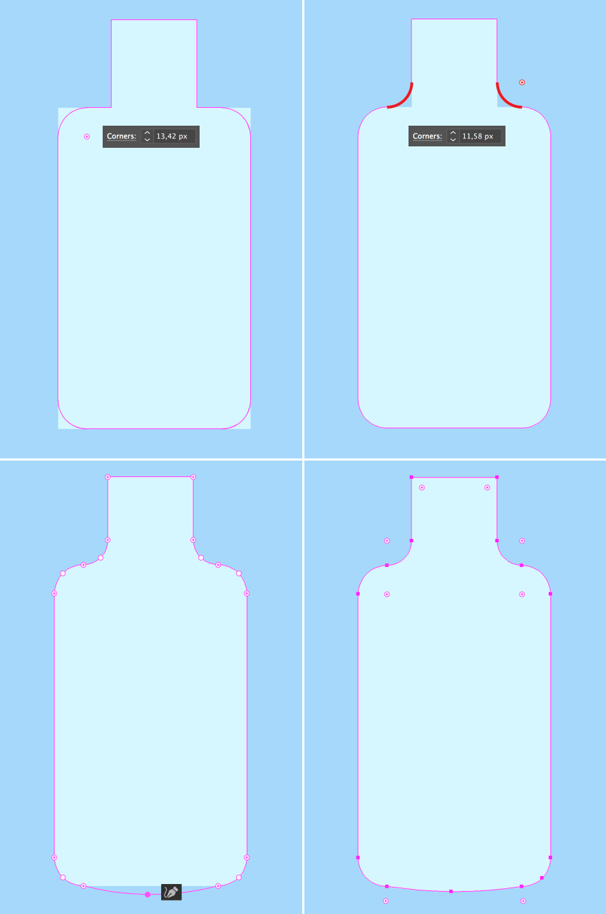 让我们用直接选择工具(A)选择瓶子的角落,并通过拉动活角的圆圈标记来让角变圆。 选择瓶身和瓶颈之间的内部角,并使其平滑。如果您喜欢圆形数字,您可以从顶部的控制面板调整角落半径。或者如果看起来不错,您可以将其保持原样。