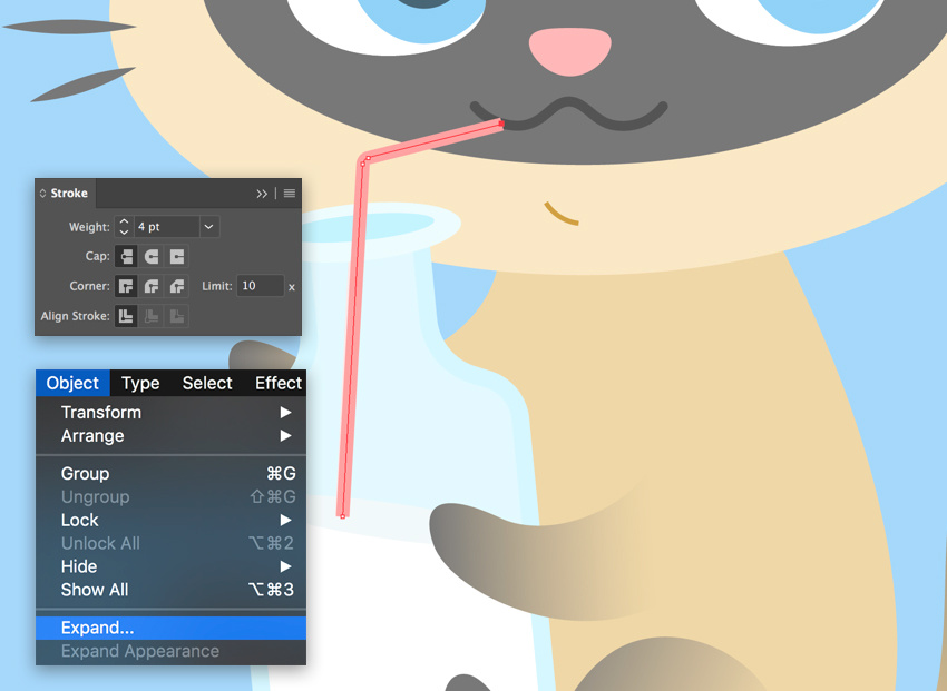 让我们添加一根吸管,使图像更细致。使用钢笔工具(P)绘制一条折线。在颜色面板中为描边应用粉红色。然后打开描边面板,将粗细设置为4pt,使吸管变厚。
