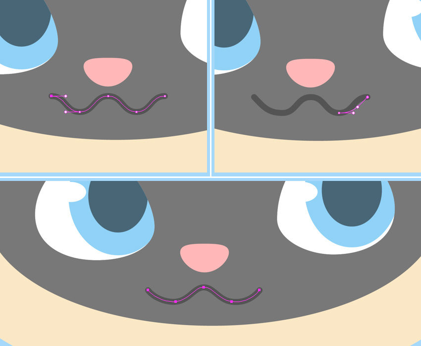 对象>扩展外观以应用效果。现在我们可以使用直接选择工具(A)编辑线的末端。向下旋转锚柄,使嘴角变圆。