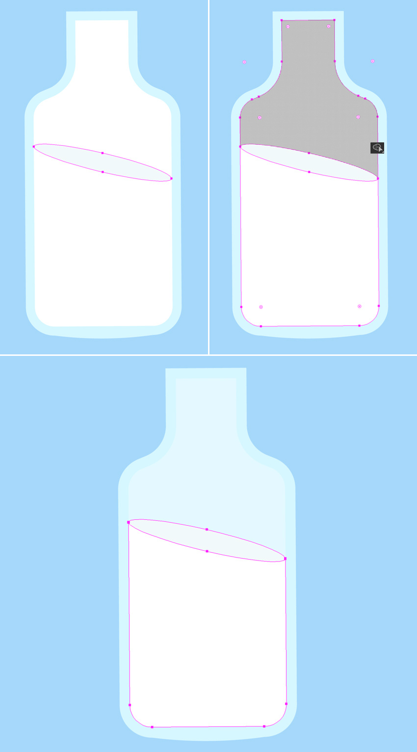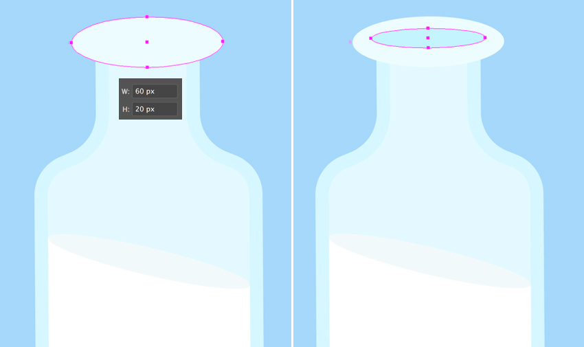 我们让瓶子半空!创建一个椭圆,旋转它,并调整大小,使其适合瓶子的内部。选择椭圆和牛奶形状。 现在抓住形状生成器工具(Shift-M),按住Alt键,一旦你看到鼠标光标旁边一个微小的减号,就将其悬停在牛奶形状的上半部分。 一旦它变成灰色,单击它,以删除这一块。太棒了!一半的牛奶消失了!