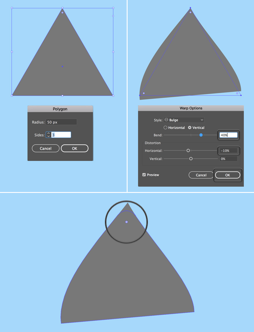 现在让我们改变形状,使它看起来更像一只耳朵。保持选择,转到效果>变形>凸出并将垂直弯曲值设置为40%; 水平扭曲至-10%。 这样,我们的形状膨胀并向左弯曲。