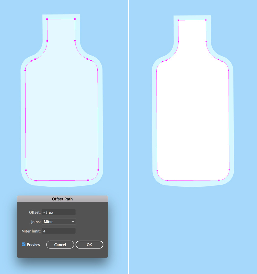 转到对象>路径>偏移路径,并将偏移值设置为-5 px,从而创建一个更小的内部轮廓。 用浅蓝色填充,使瓶子的玻璃边缘变厚。复制(Control-C> Control-F)新形状,并将副本填充白色的牛奶。