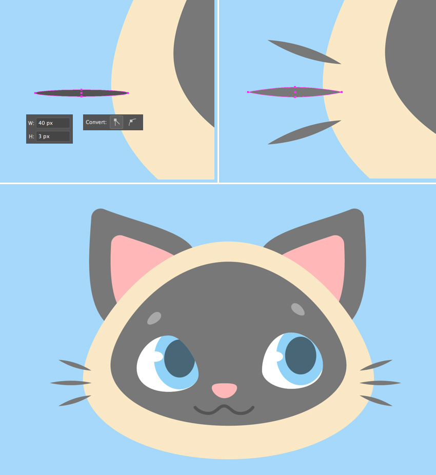 我们用椭圆工具(L)绘制胡须。做一个40 x 3像素的深灰色圆圈,使用直接选择工具(A)选择其侧面的锚点,并将选定的锚点从顶部的控制面板转换到角落,使得椭圆的尖端变得锋利。