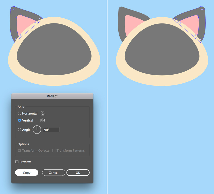 双击镜像工具(O) ,选择垂直轴,然后单击复制,创建耳朵的镜像副本。将其连接到头部的相对部分。