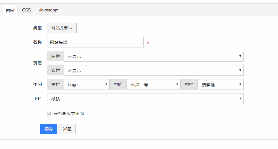 顶部导航的设计成熟稳重,比较中规中矩,但不容易出现太大的问题,所以使用率也是比较广的。熟悉我的人都知道我用蝉知在做网站,下图就是蝉知系统后台界面中头部导航的定义,可做多种组合在前台显示效果。