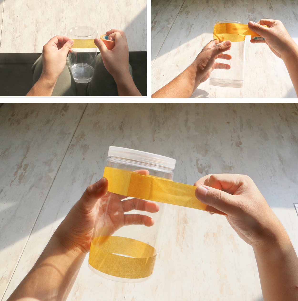 第一步:两个塑料瓶的直径要一大一小,直径相差在2-3cm即可,但是小的塑料瓶直径要大于8cm,因为市面上时钟机芯的尺寸普遍在6×6cm,我用的大塑料瓶直径11cm、小塑料瓶直径8.5cm,高度大于10cm即可,后续还会切割掉。我们先拿出大的塑料瓶,先用纸胶带上下各绕一圈,胶带在开始和结束粘贴的地方一定要完全重合在一起,这样方便我们后来裁切的时候是一条直线不会歪七扭八,防止水泥流出。