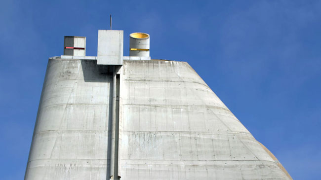 螺旋光圈是如何产生的呢?细看可以看到混凝土的壳体上有雨水槽,阳光穿过圆洞的有机玻璃,经过折射打到雨水槽上,雨水槽便成为这些光线的反光板。