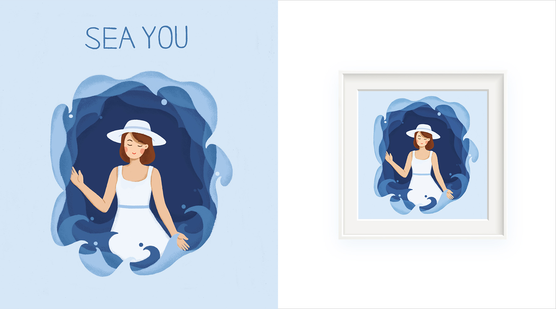 在我们感叹插画师完成后的插画及周边是多么让人喜欢的时候,你是否想过这些作品和周边是怎么做出来的呢?这些插画背后优化的过程,周边的应用方式就是本文接下来要讲的内容。以Jenny的《SEA YOU》为例,来看看一副插画背后的优化过程和周边应用~先看下完成稿及画框应用~