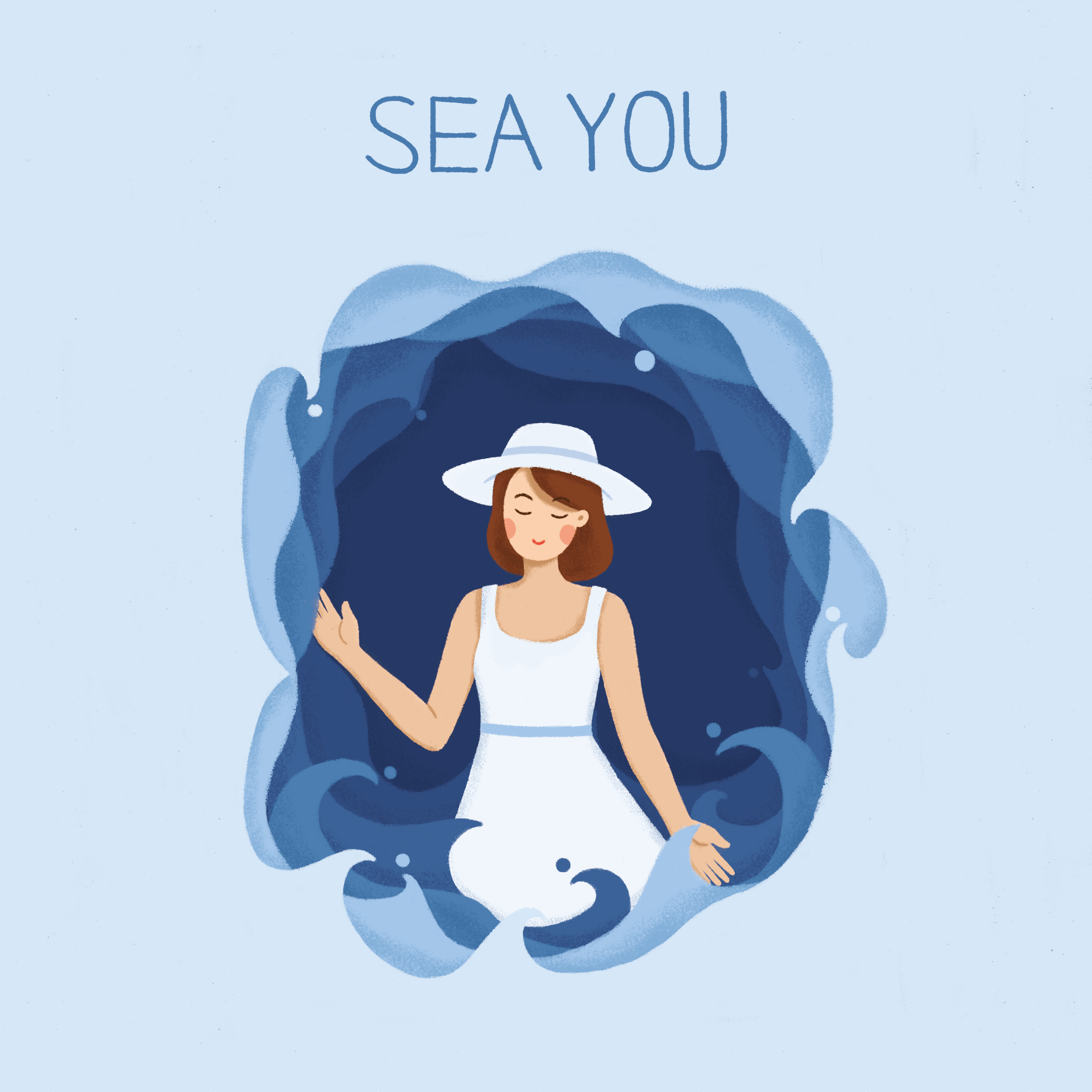 《SEA YOU》主题为在水边的妹纸,所以设计了一个在水边一手拎着裙角,一手拿着遮阳帽的妹纸,辅助的环境使用水相关的内容。确定主题后,那就开画~