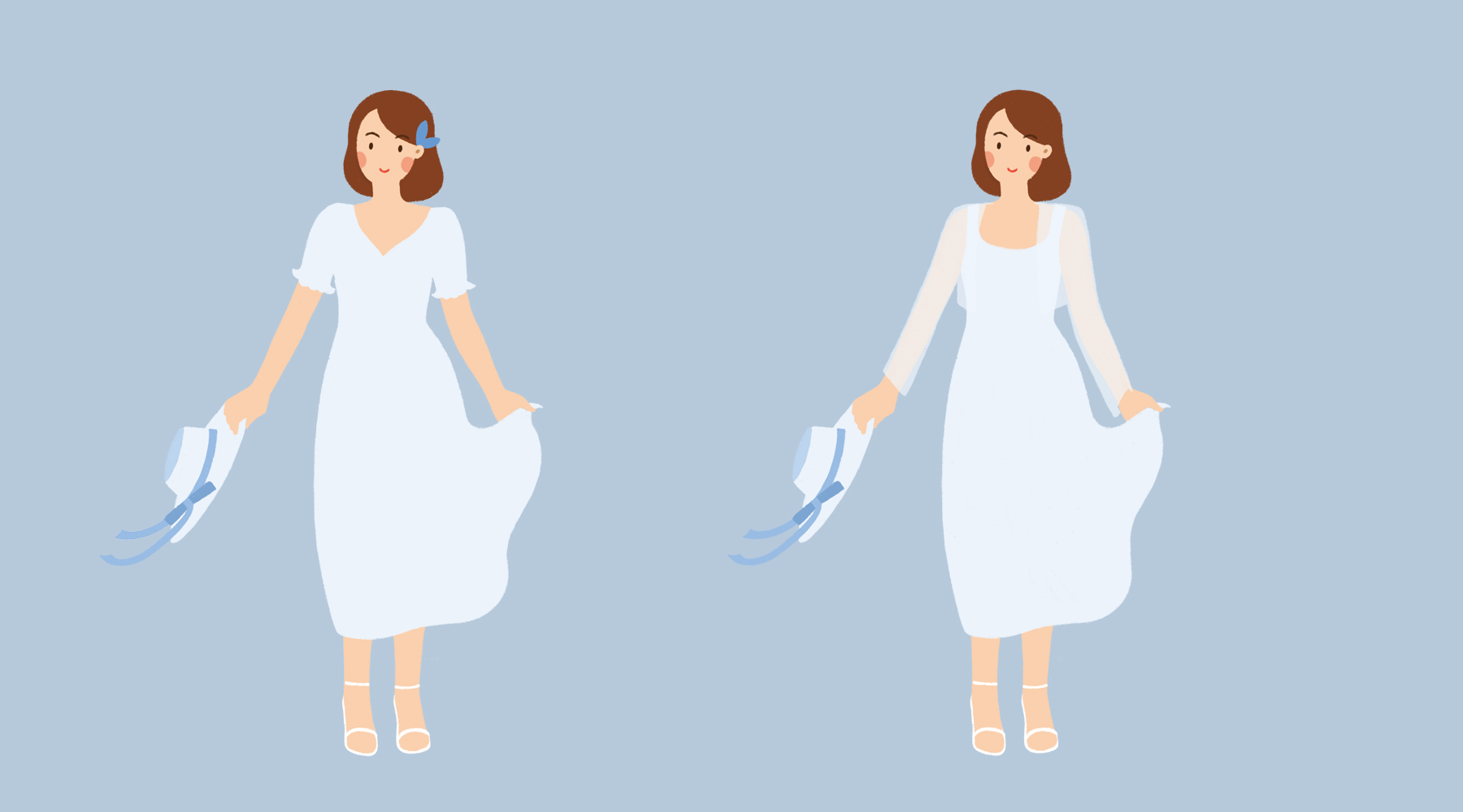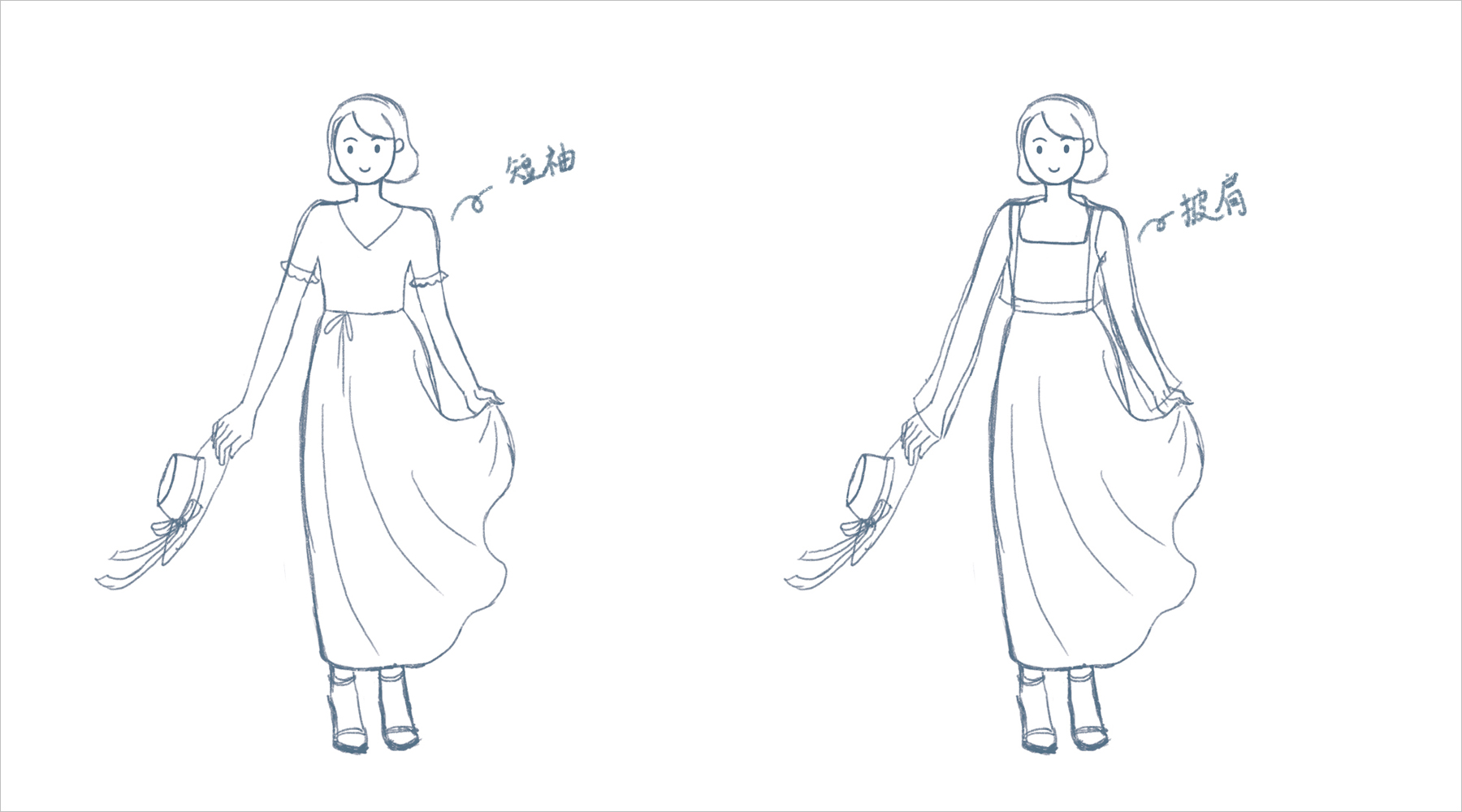 整理人物的细节,把结构明确的画出来;在服饰方面,尝试了短袖和吊带披肩2种。