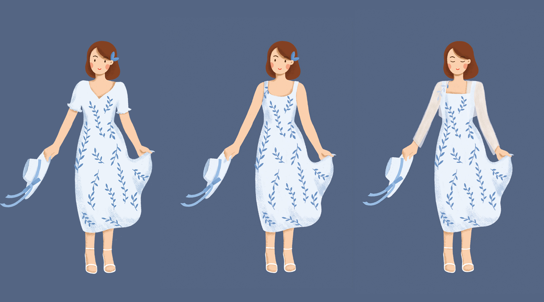 睁开的眼睛、闭上的眼睛,衣服的不同样式,颜色、花纹等的反复调整;添加人物身上的投影质感。最后我选择了闭上眼&吊带裙的形式,闭眼可以给人带来更多遐想空间,吊带也会更清爽。