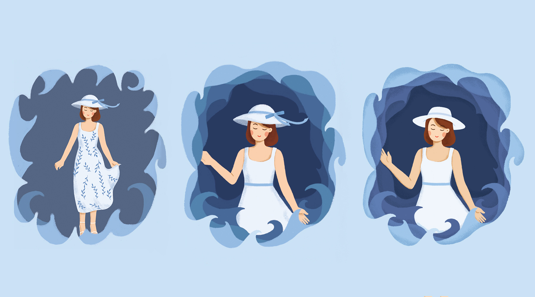 添加环境元素——海浪,并且把海浪作为镜框,将人物收在画里。这时,我们可以看到人物显示全身的话,画面会比较空了,于是将人物调整大一些,改为显示半身。同时衣服上的花纹太繁复了,所以去掉花纹(画了这么久的花纹说去掉就去掉了╮(╯_╰)╭)。拿在手里的帽子改为带在头上,同时帽子软软的形状跟画面里海浪整体的风格不搭,改为更硬朗的没有蝴蝶结的圆帽。