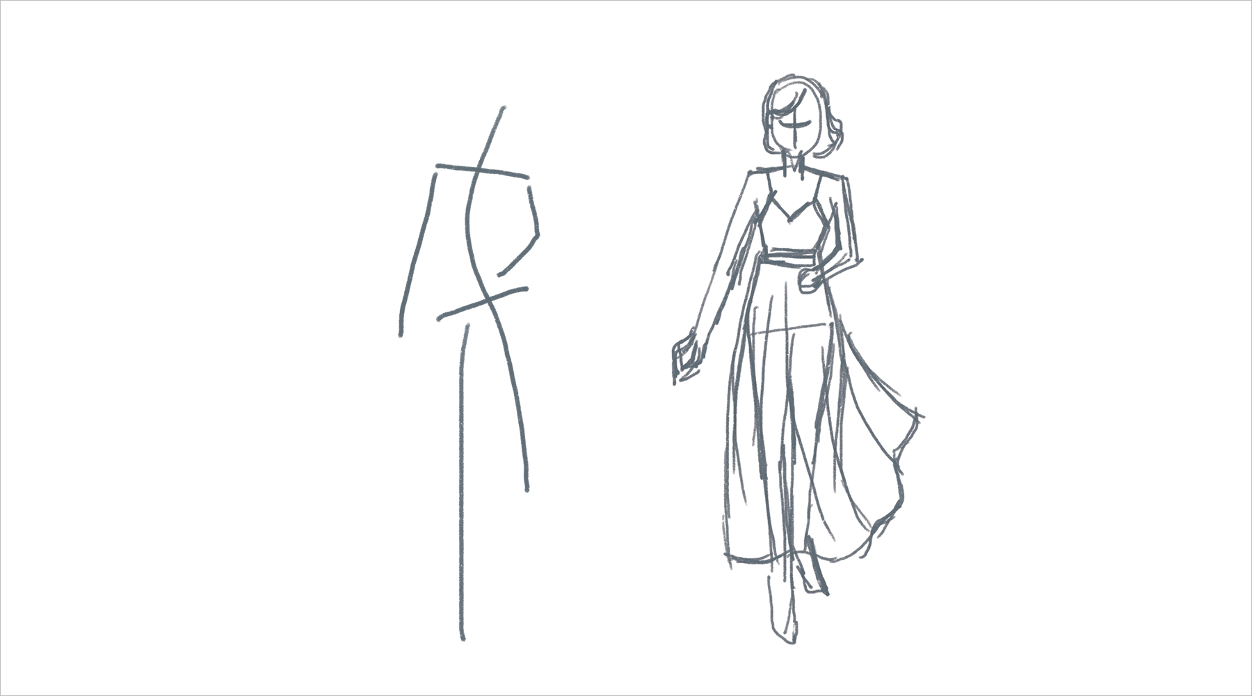 我们首先简要勾勒出人物的形态、动势,确保人物的生动性。潦草一些也没关系,因为我们会在下一步线稿阶段把细节整理出来。