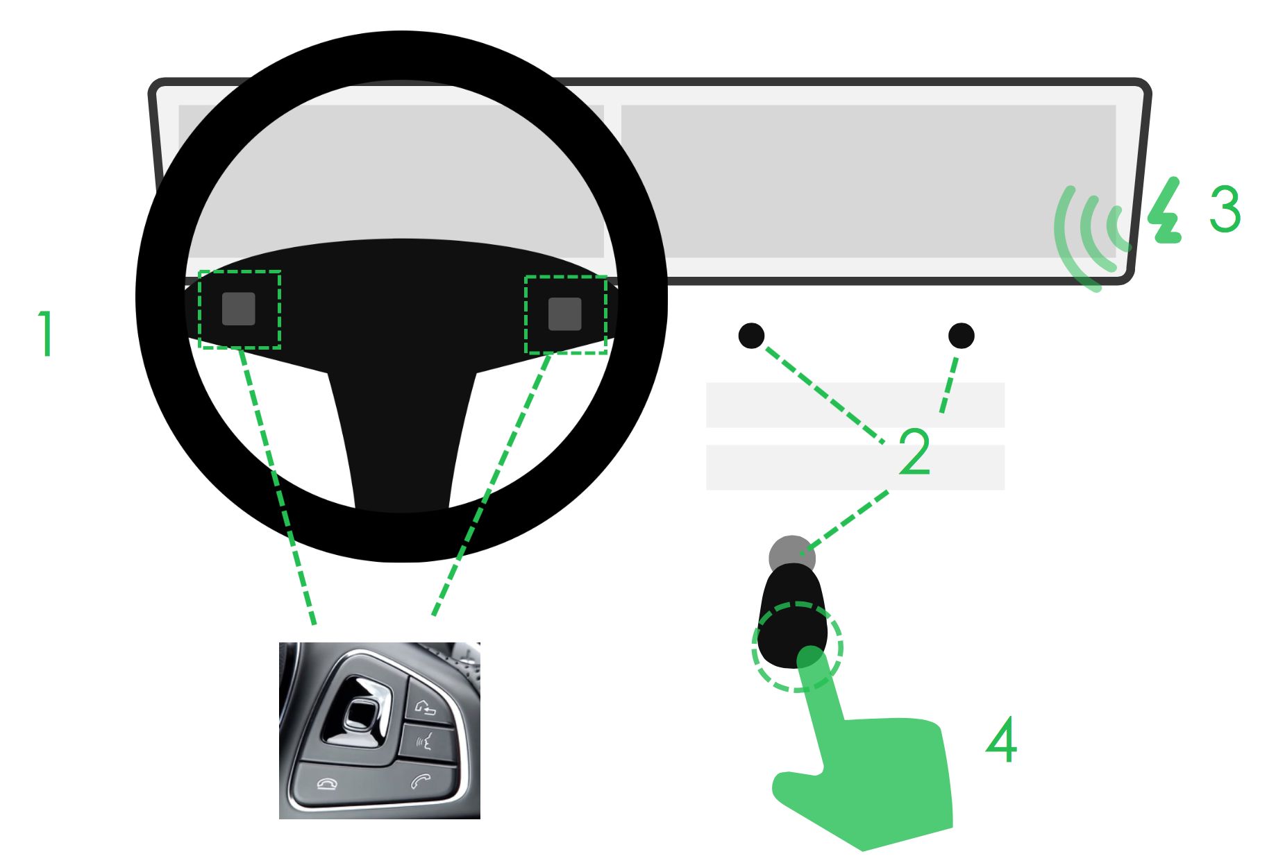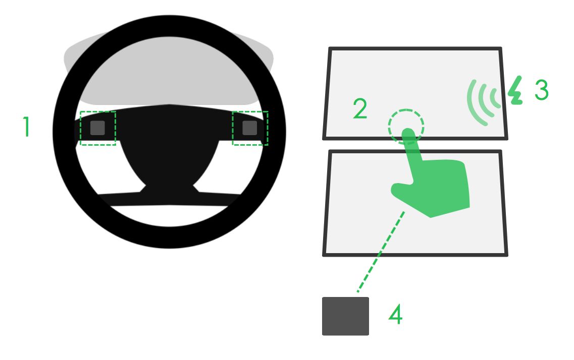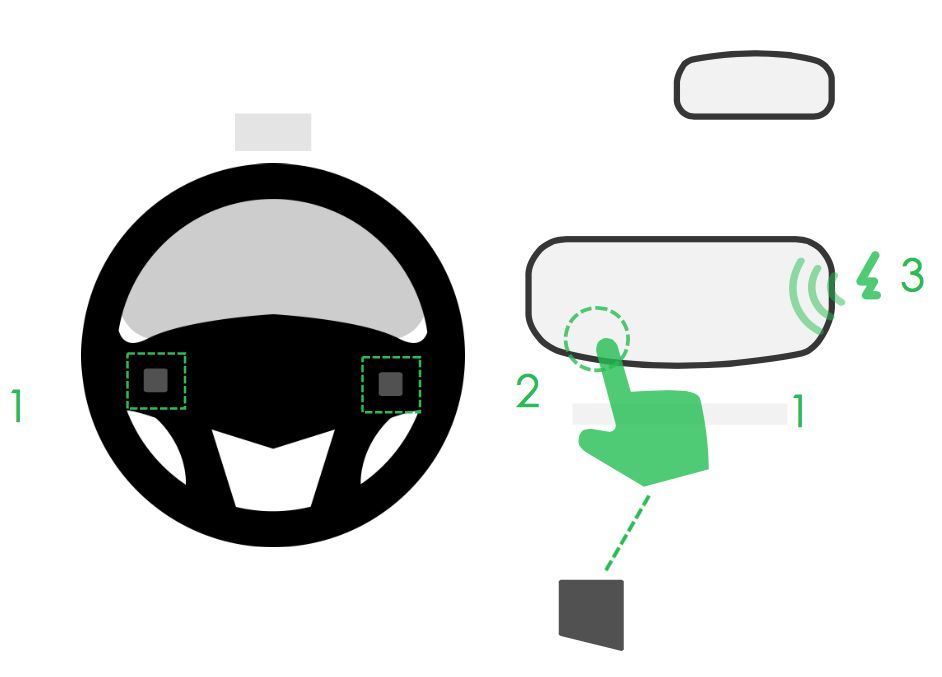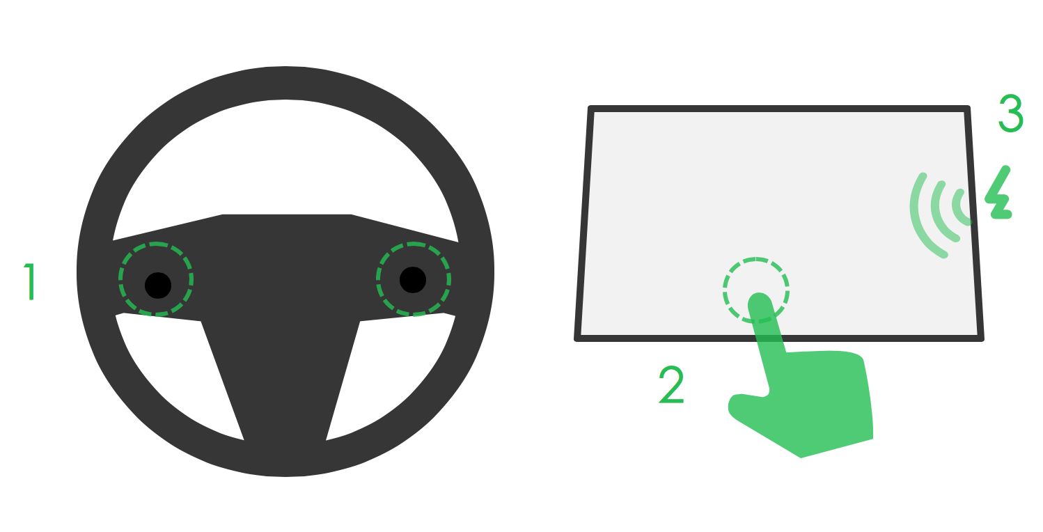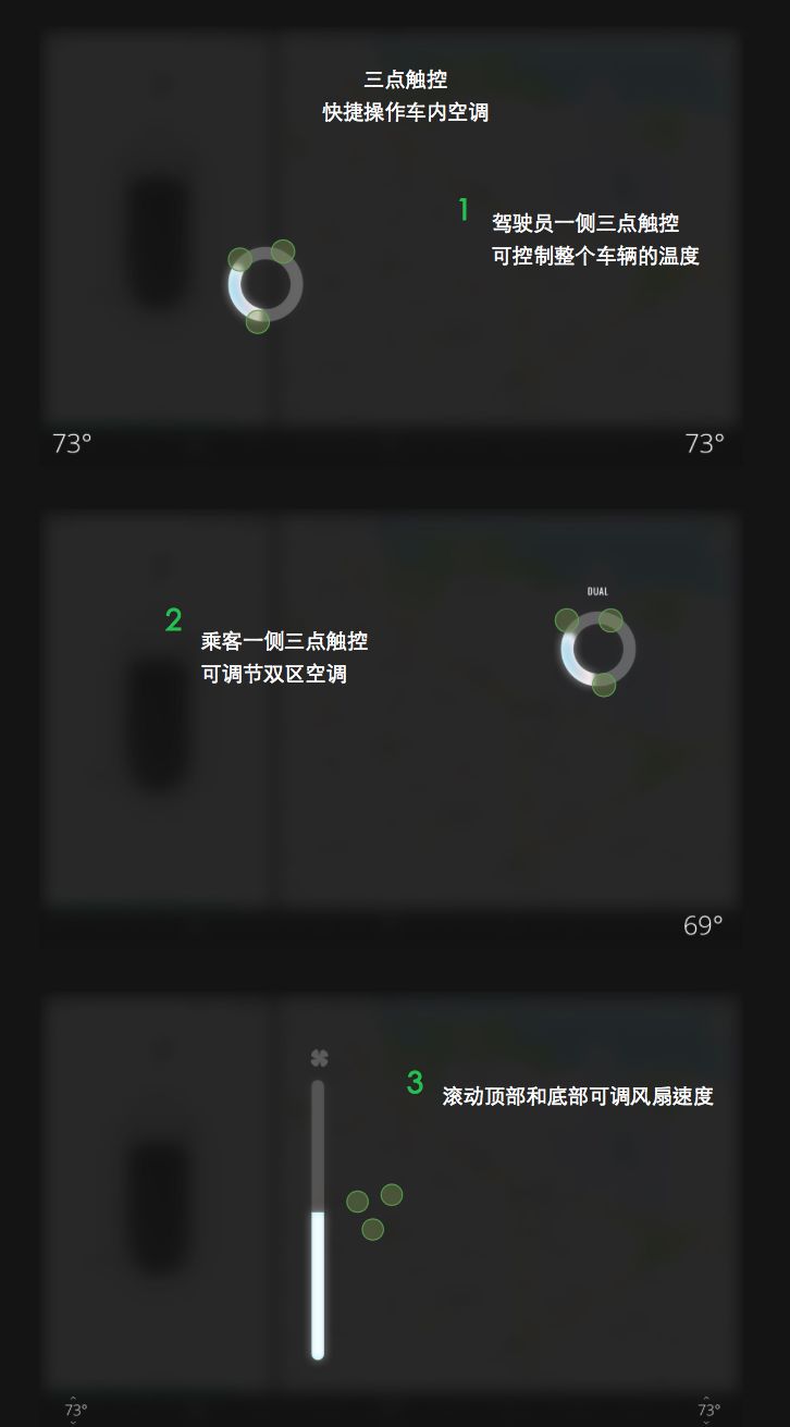 在传统车型上面,很多快捷操作可以通过物理按钮进行触控。设计师Michael Cherkashin在触屏操作方式上根据驾驶者物理操作习惯设计两种快捷触控方式:2点触控和3点触控,从另一个角度上来说需要花费一定的学习成本。