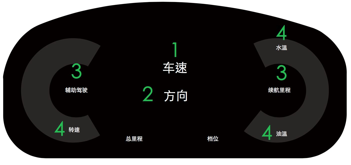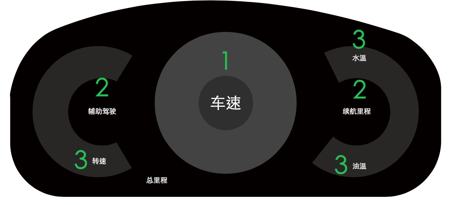 1 车速、剩余油量和转速、水温作为一级信息左右对称排布;
