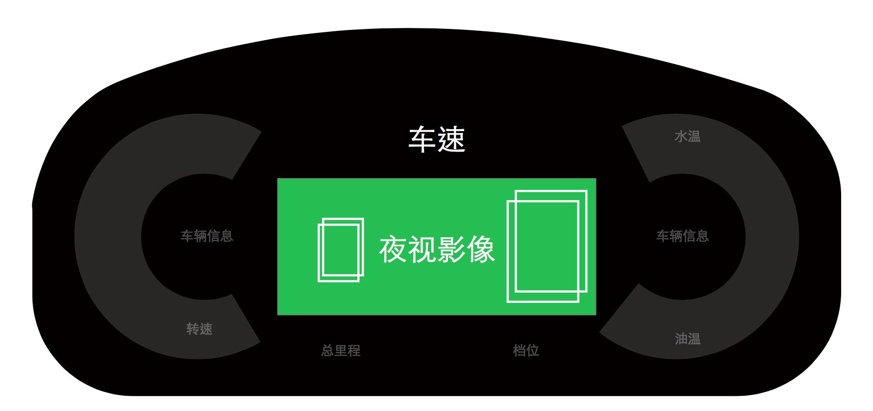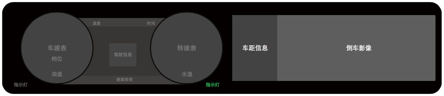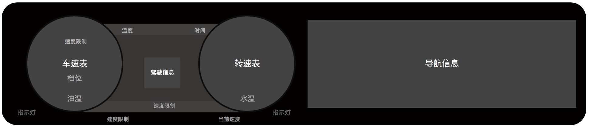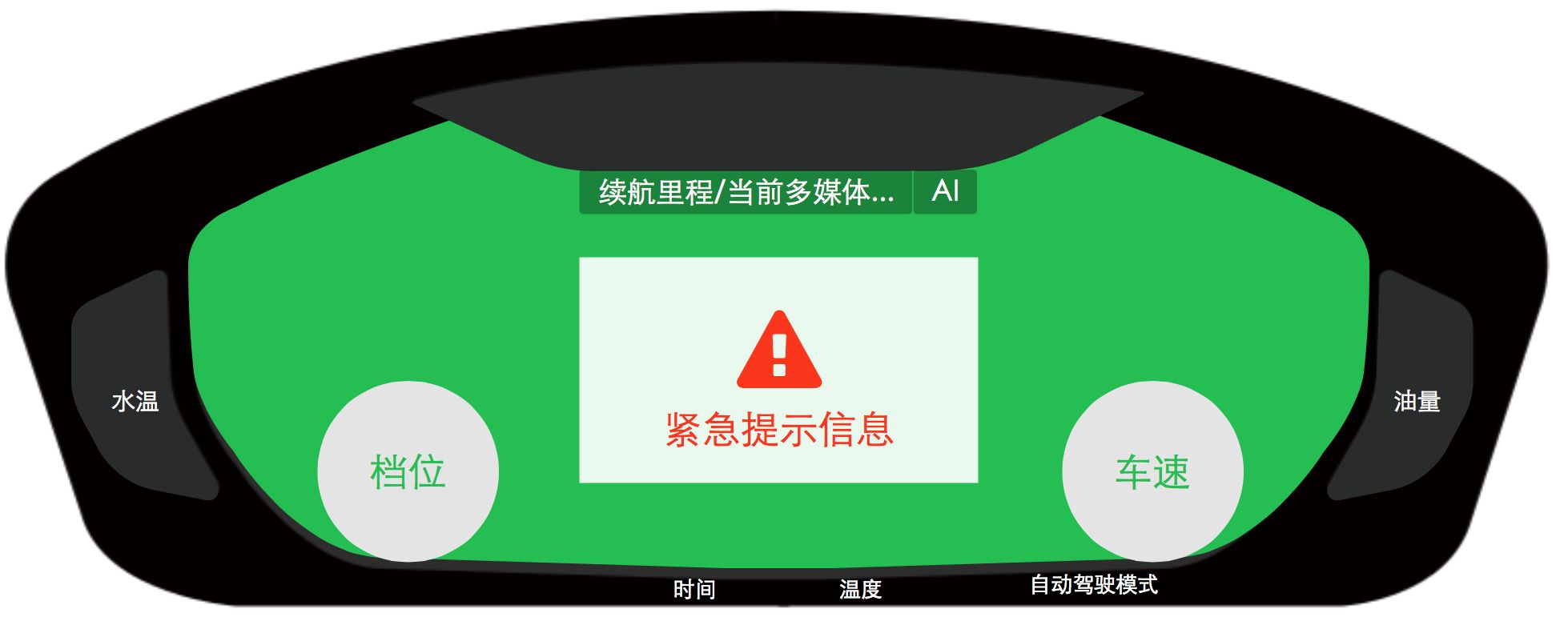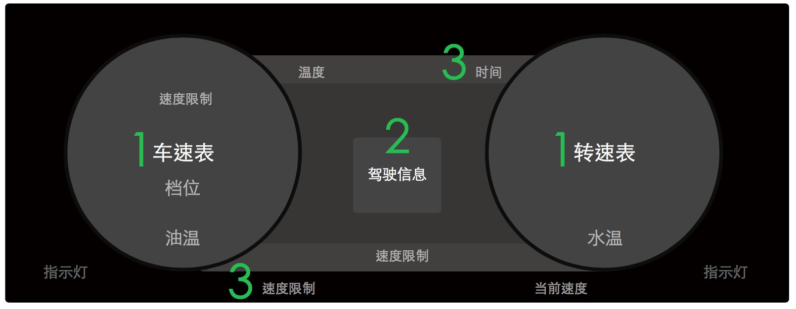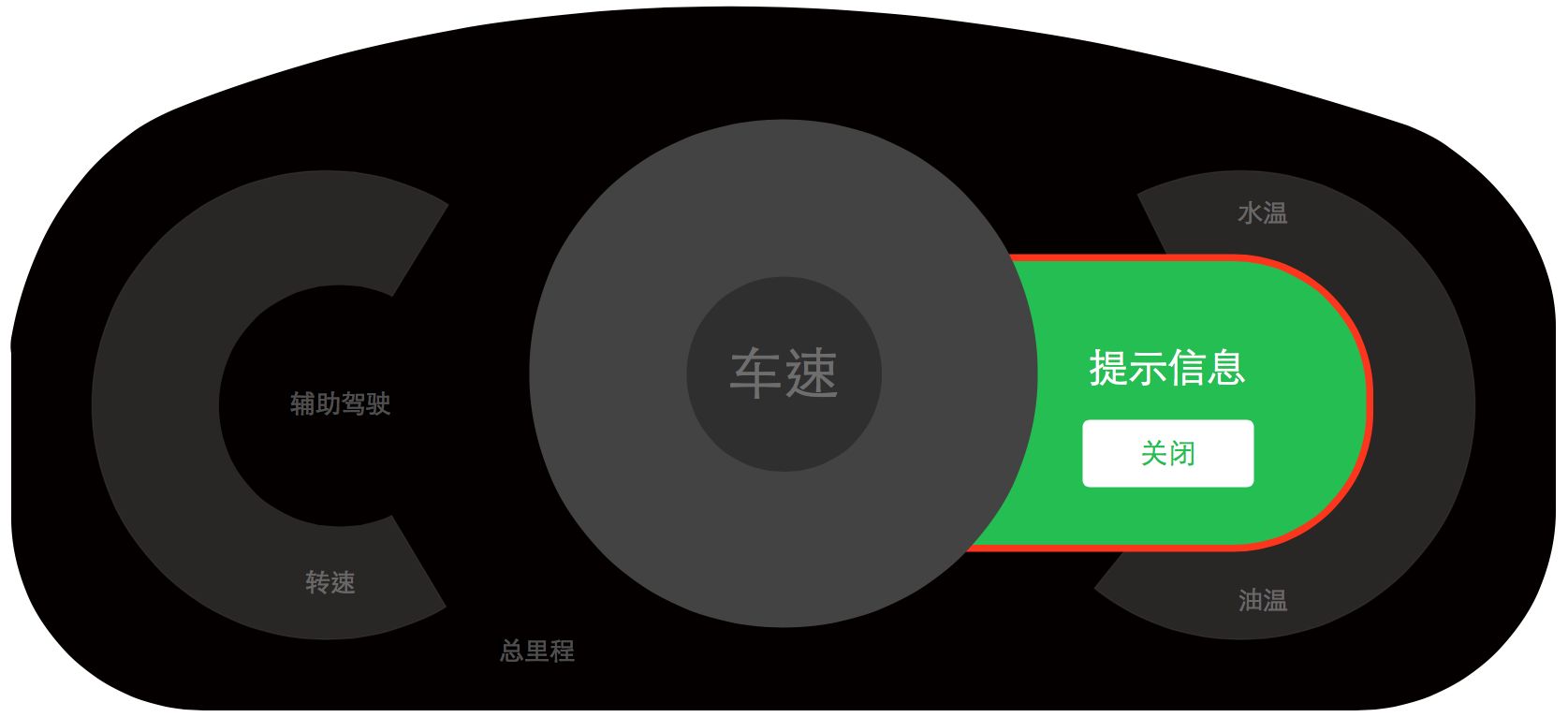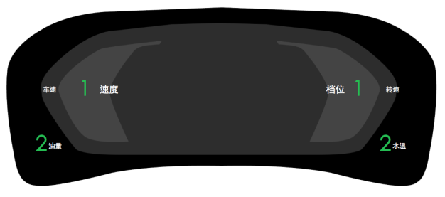 3 围绕仪表盘内侧三块区域作为三级信息固定显示水温和油量、故障提示。