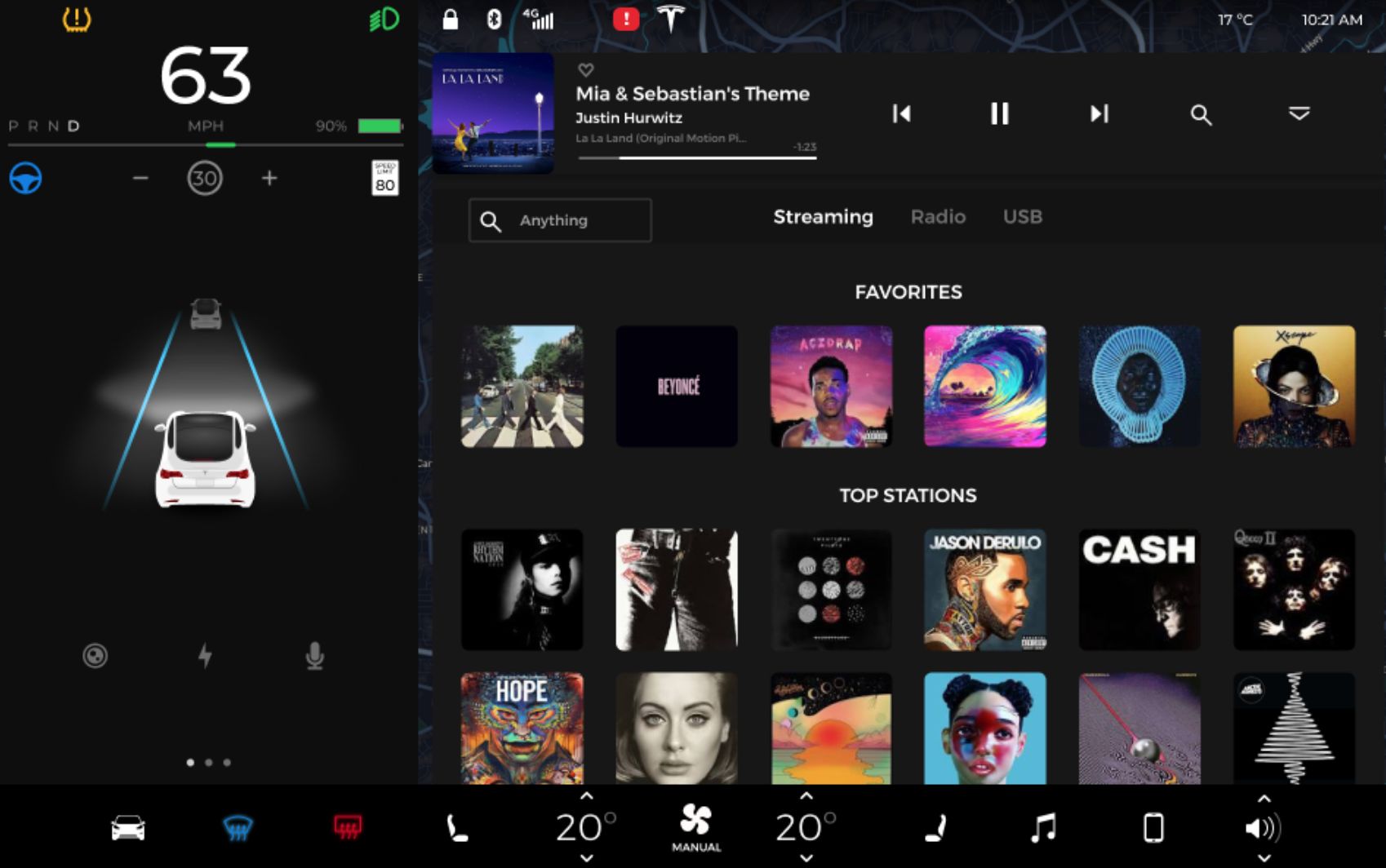 Tesla Model 3 作为前瞻性产品,在概念上将仪表去掉,将传统仪表信息移到中控屏上。将整个屏幕模块化。在功能分区上还是较传统用户习惯来分为传统的三块区域(如下图所示)。较其他四款产品相比,驾驶安全性极大的弱化转向娱乐化需求。