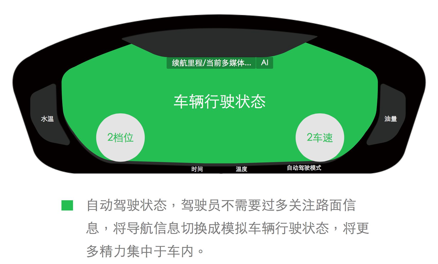 2 作为屏幕中心的二级信息将驾车有关的信息放于中央,信息集中,很好的保证驾驶员注意力不会过度分散;
