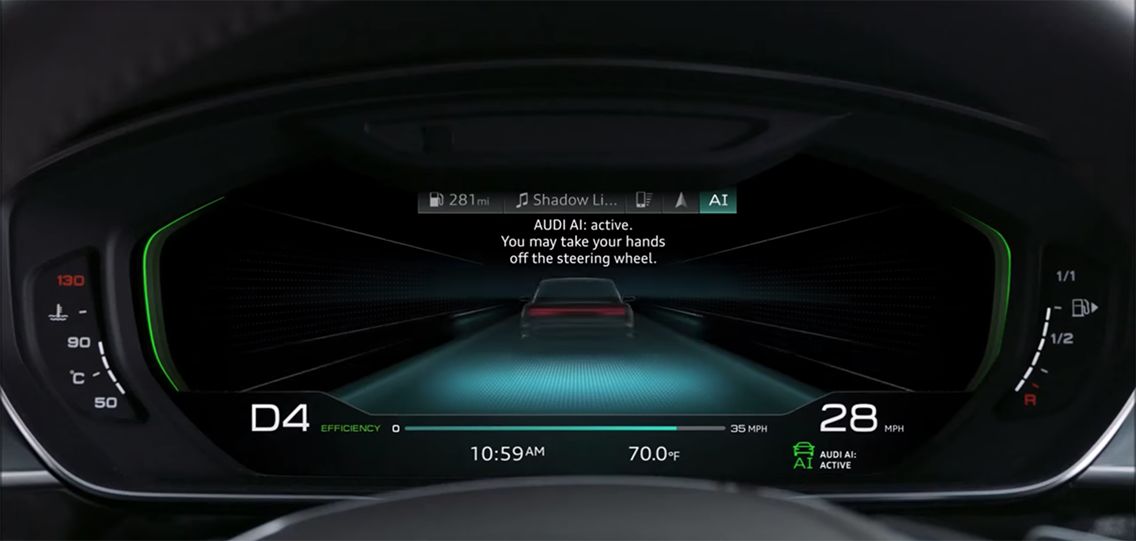 即Audi traffic jam pilot——拥堵状态自动驾驶):奥迪官方表示在驾驶速度小于60km/h时可以开启自动驾驶系统。对于此款车型上L3自动驾驶级,在拥堵场景时司机开启此功能后在漫长的拥堵时间做任何自己想做的事情。
