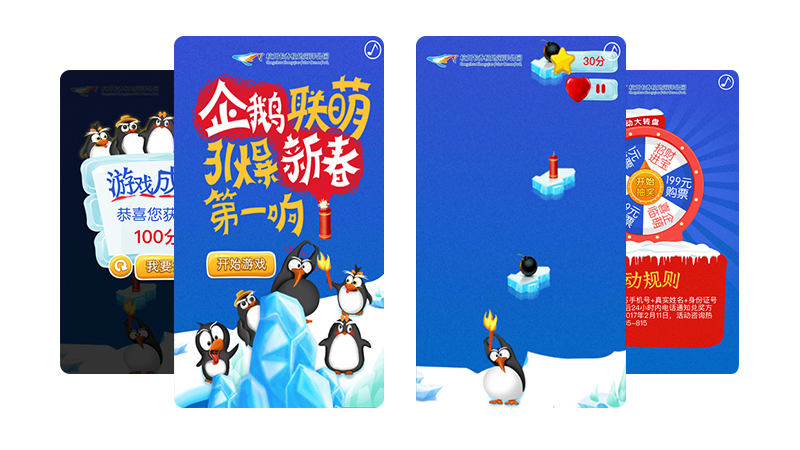 亮点:进入案例选取喜欢的企鹅角色,左右拖动企鹅,控制企鹅去点燃炮仗,在规定时间内,点燃炮仗越多,分数越高;点燃炮仗更符合新春气息,更能体现节日。挑战成功达到分数后就可以参与大转盘抽奖。